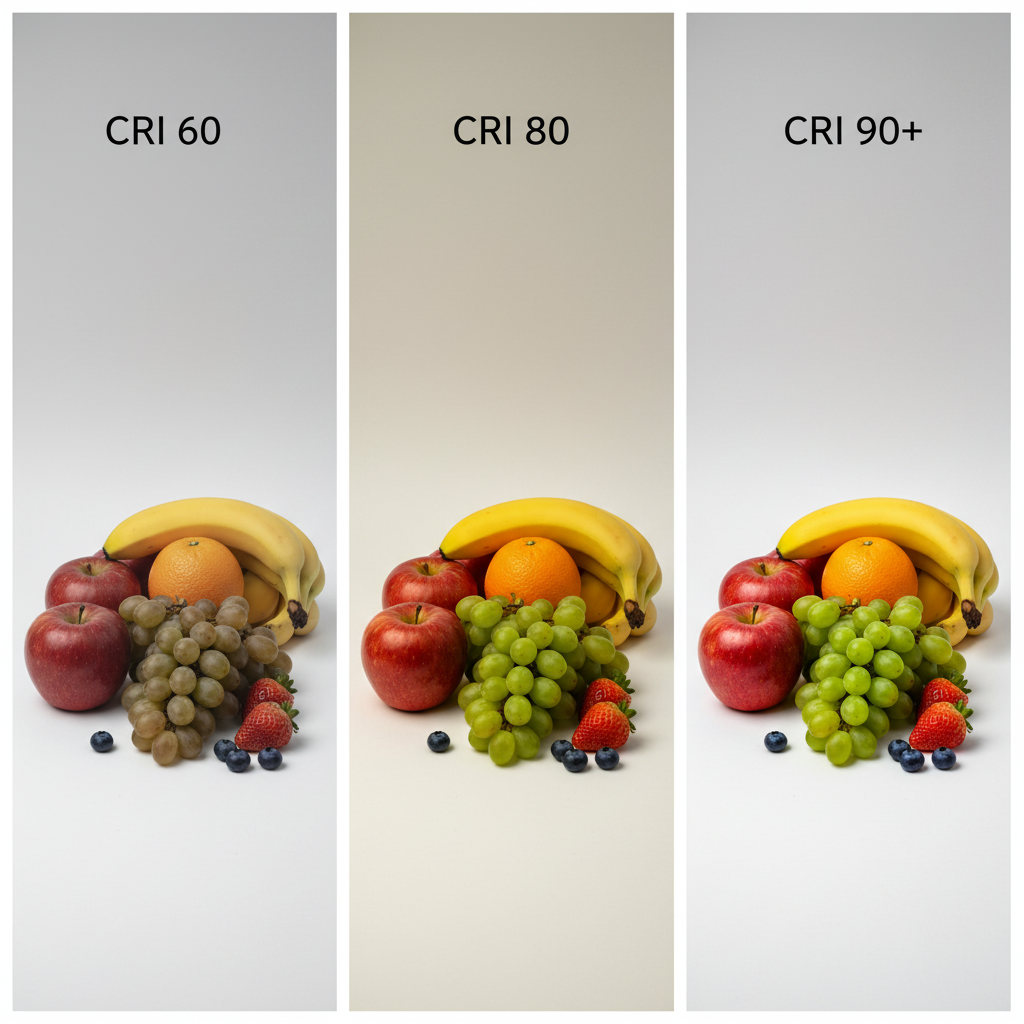 - A CRI of 90+ is recommended for kitchens (to see if food is fresh), bathrooms (for applying makeup), and art studios or workshops where color accuracy is critical.